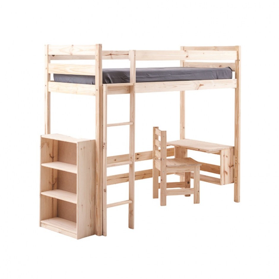 Made from sturdy, raw pine, this Bunk Bed fits 1 single mattresses, it also has a desk, chair and bookshelve.
